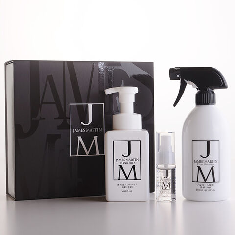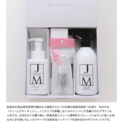 ■備考:・飲食店の食品衛生管理の観点から開発されたプロ仕様の除菌消臭剤『JAMES MARTIN(ジェームズマーティン)』。インテリアを邪魔しない スタイリッシュで洗練されたデザインも人気です。大切な方への贈り物に、除菌消臭スプレーと携帯用スプレー、さっぱりした洗い心地なのに手の潤いも しっかりキープする薬用泡ハンドソープの詰め合わせギフトボックスです。