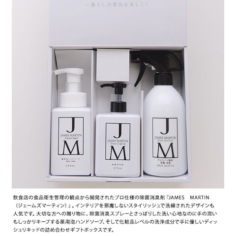 ■備考:・飲食店の食品衛生管理の観点から開発されたプロ仕様の除菌消臭剤『JAMES MARTIN(ジェームズマーティン)』。インテリアを邪魔しない スタイリッシュで洗練されたデザインも人気です。大切な方への贈り物に、除菌消臭スプレーとさっぱりした洗い心地なのに手の潤いも しっかりキープする薬用泡ハンドソープ、そして化粧品レベルの洗浄成分で手に優しいディッシュリキッドの詰め合わせギフトボックスです。