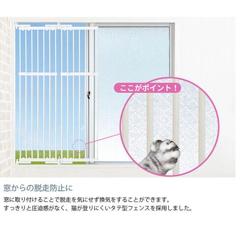 腰高窓などに取り付け可能な窓用フェンス。愛猫の脱走を防止します。突っ張り式で工具不要の簡単取り付け。高さ調整も自由にできるので、柔軟に対応します。
