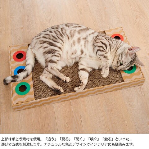 上部は爪とぎ素材を使用。「追う」「見る」「聞く」「嗅ぐ」「触る」といった、遊びで五感を刺激します。