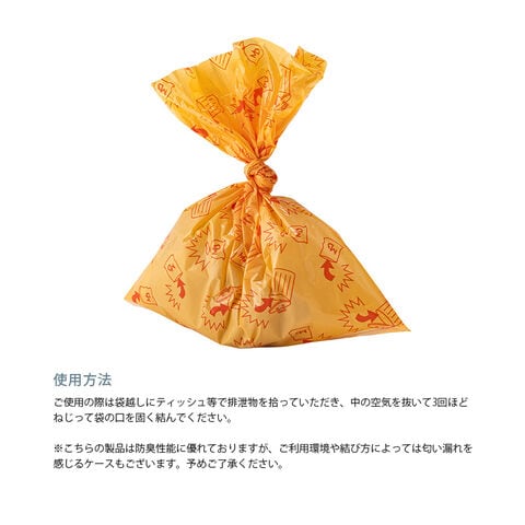 ご使用の際は袋越しにティッシュ等で排泄物を拾っていただき、中の空気を抜いて3回ほどねじって袋の口を固く結んでください。