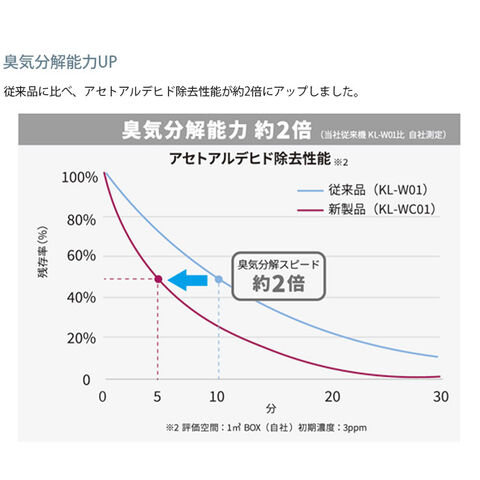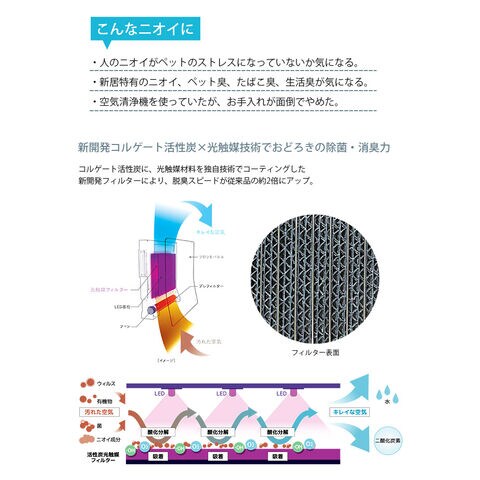 従来品に比べ、脱臭スピードが約2倍、お手入れ時期が約2倍に長持ちするようになりました。