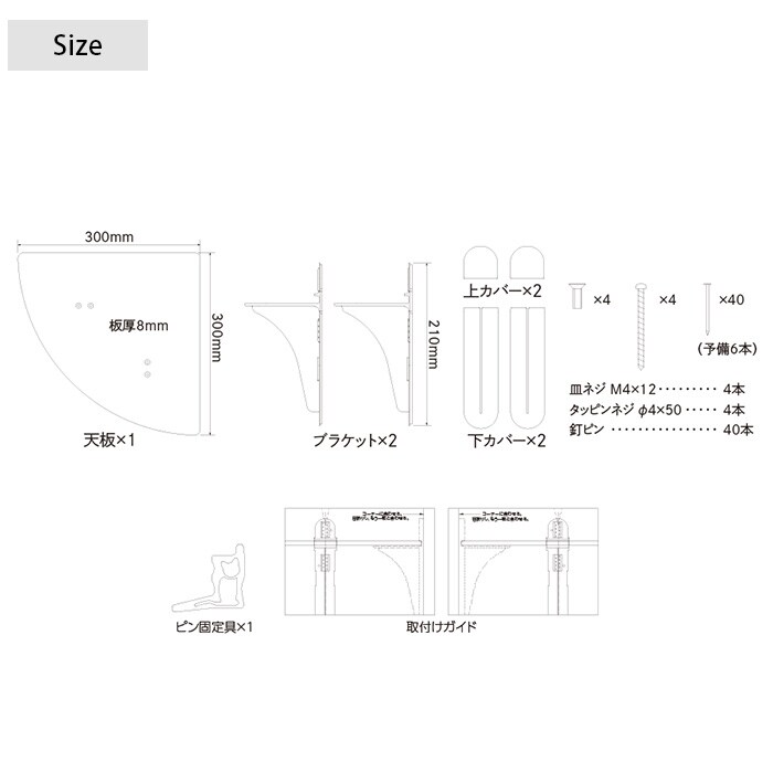 付属品:皿ネジ、タッピングネジ、釘ピン、ピン固定具、取付けガイド