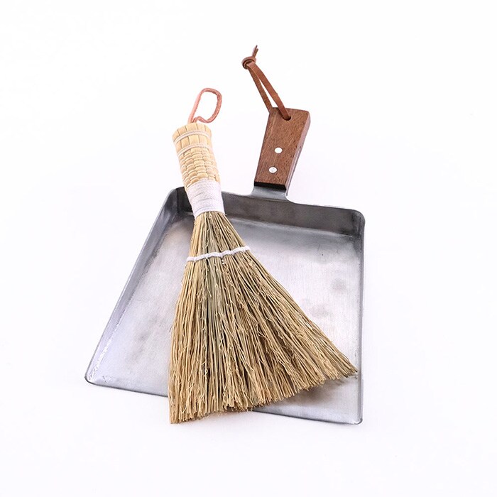 レザーの紐付き。ほうきと一緒にかけて収納でき、出しっぱなしにしていてもインテリアとして様になる佇まいです。