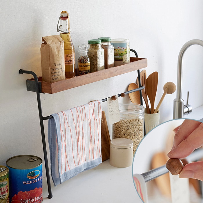 キッチンではトレイ部分にお気に入りのスパイスを並べて置いてハンガー部分にふきんを掛けてお使いいただけます。