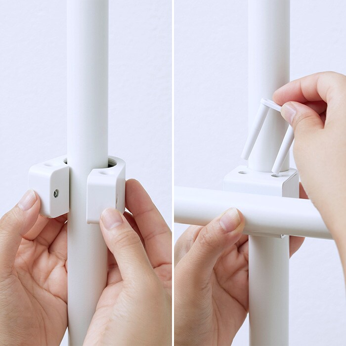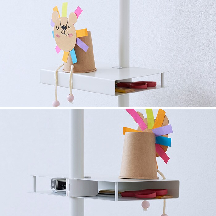 つっぱり(別売)を固定した後に付けはずしが可能。高さの調節やパーツの増設に便利です。