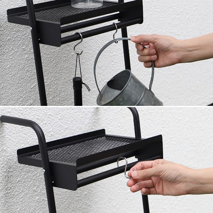 ハンガーバーにS字フックで掃除用具やガーデニング用品を吊るして収納できます。(S字フックは付属しません)
