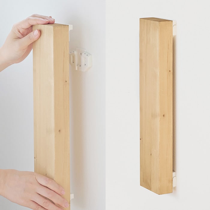 壁に小さなピンで柱材を取り付けられるブラケットです。
