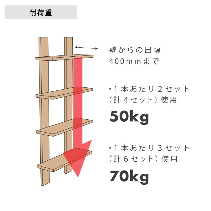 本製品とホームセンターで190cm以下の1×4材と棚板、別売の棚受けパーツ(SPFブラケット)などを組み合わせていただくことで、賃貸壁にも設置できる手作り棚やキャットステップをお作りいただけます。