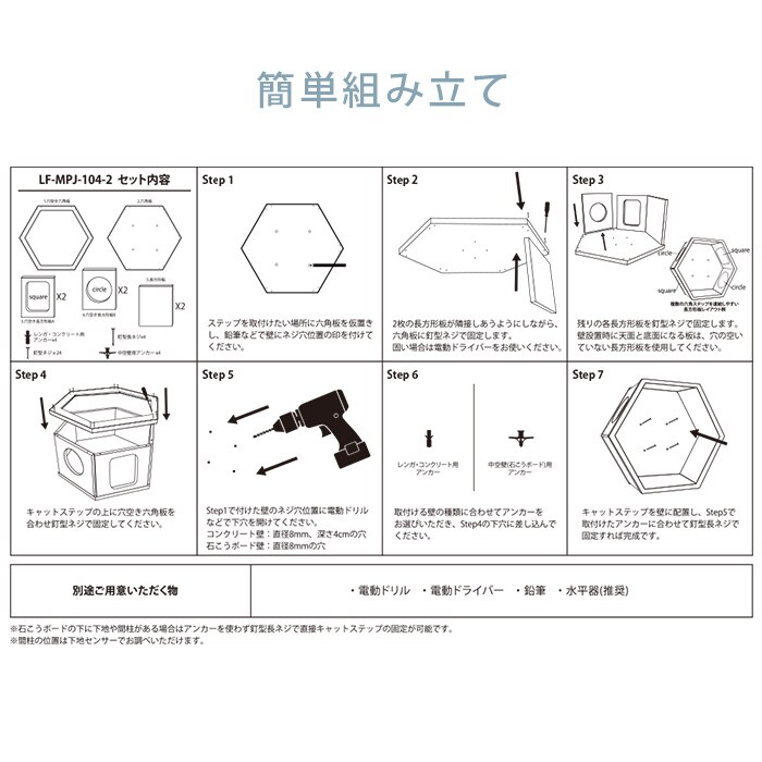 手動ドライバー、電動ドライバー、電動ドリルは付属していないため別途ご用意ください。