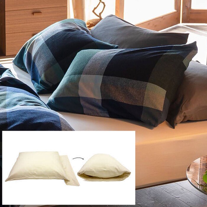 袋状になったピローケースの奥まで枕を入れ、枕の大きさに合わせて余った部分を折り込んでください。