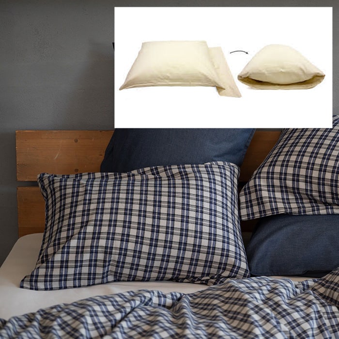 袋状になったピローケースの奥まで枕を入れ、枕の大きさに合わせて余った部分を折り込んでください。