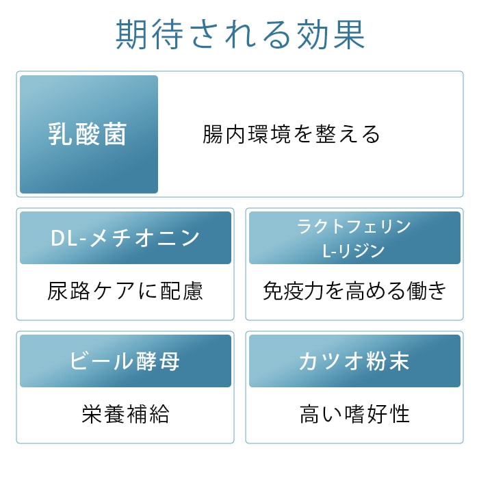ラクトフェリン配合。猫にとって必須アミノ酸のDLメチオニンは尿の酸性化をサポートする働きがあります。Lーリジンも配合。