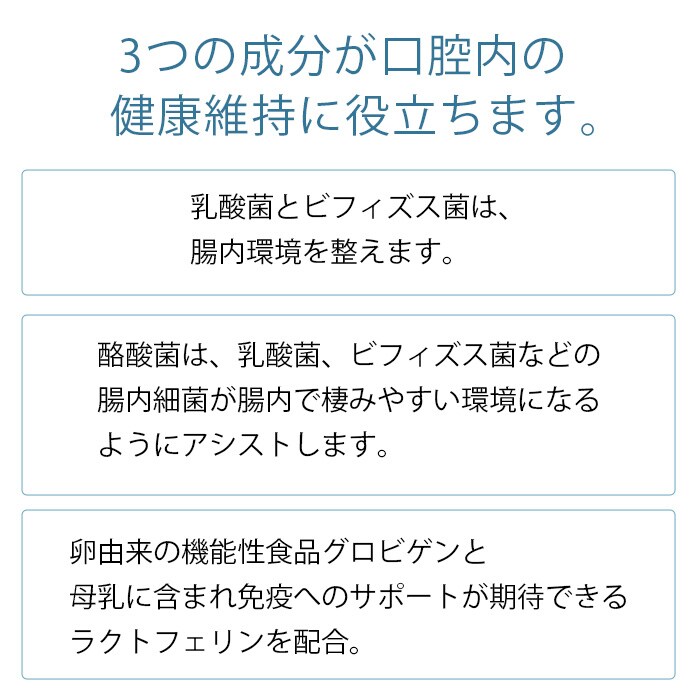 乳酸菌、ビフィズス菌、酪酸菌の3つの菌を配合した口腔ケア犬用サプリメント。