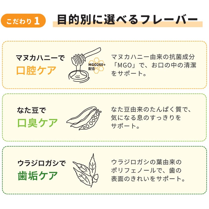マヌカハニー由来の抗菌成分「MGO」で、お口の中の清潔をサポート。
