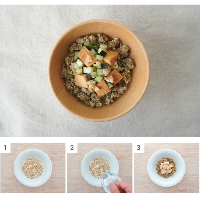 お湯を加えたベースデリをドライフードにトッピングすればベースデリの香りで美味しく、手軽に水分補給をすることができます。