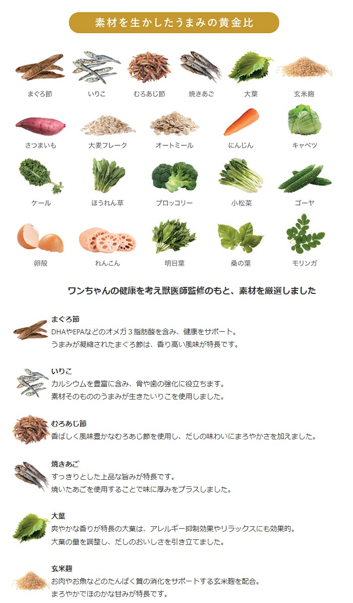 ■原材料:大麦フレーク、さつまいも、オートミール、まぐろ節、煮干しいわし、むろあじ節、焼きいりこ、焼きあご、あご煮干し、卵殻、にんじん、大葉、玄米 、あじ煮干し、キャベツ、れんこん、ケール、ブロッコリー、ほうれん草、小松菜、苦瓜、明日葉、桑の葉、モリンガ