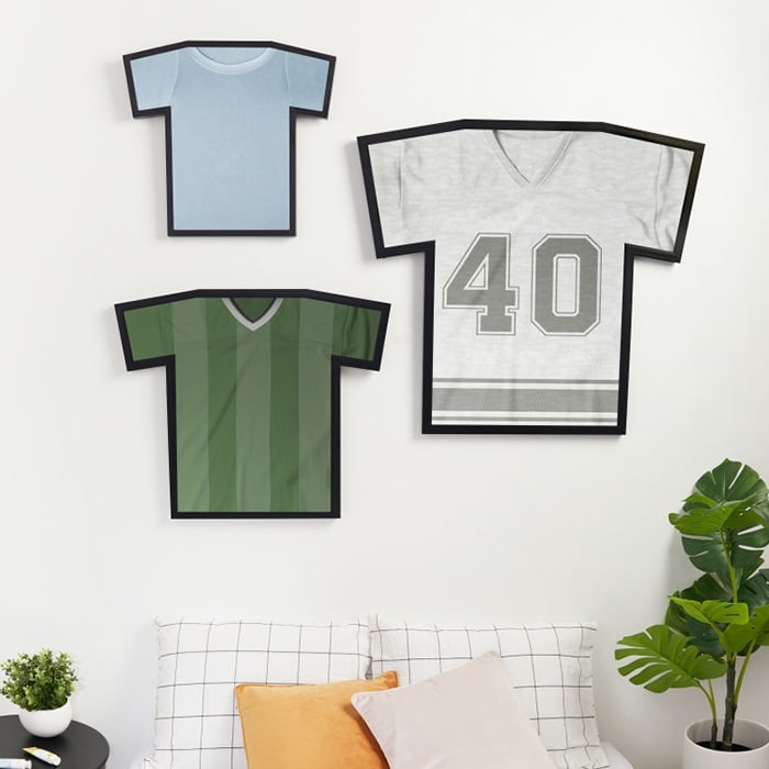 野球やサッカーなどのスポーツユニフォームなどはもちろん、サイズアウトしたTシャツや大切な思い出のTシャツなど、大事にしているアイテムのディスプレイにも◎。