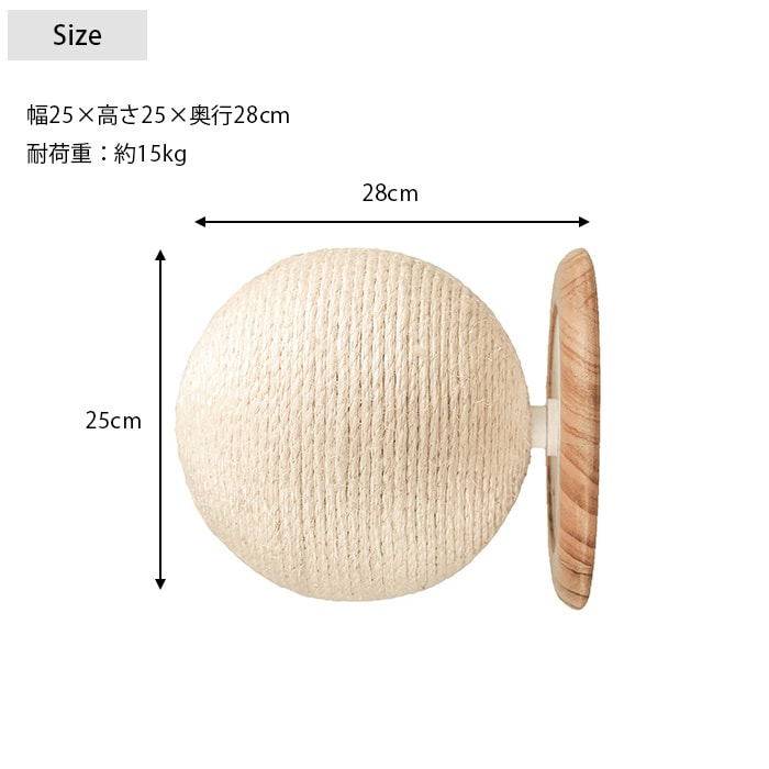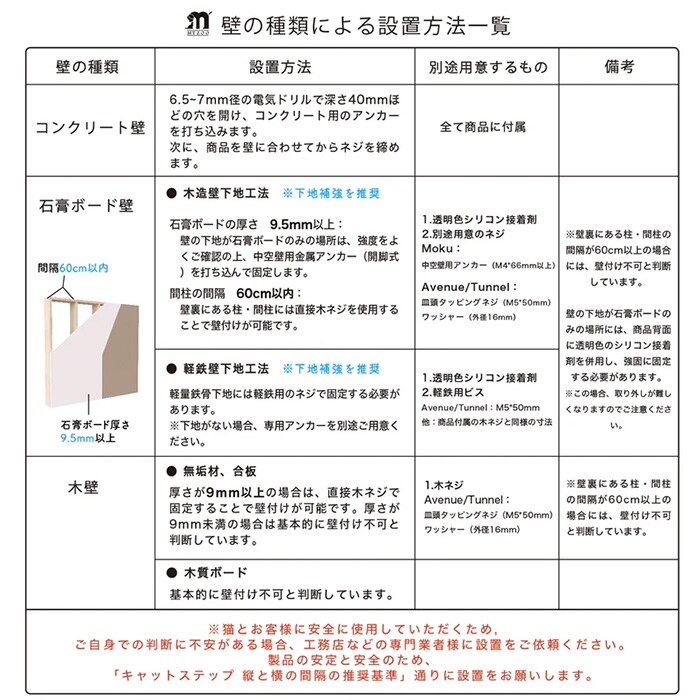 ※静止荷重のため、猫の使用における耐荷重は下地補強がされている場合を前提とし、15kgを目安としてください。