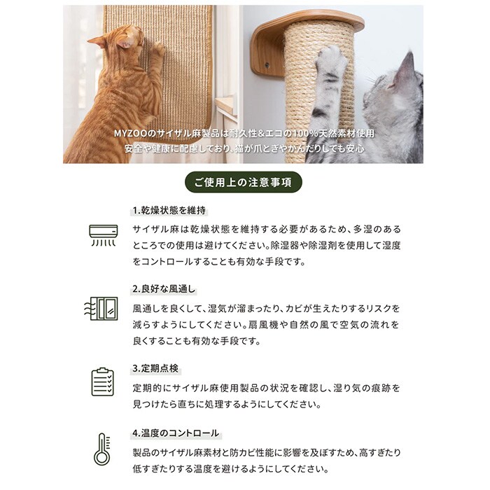 然の高密度サイザル麻を職人の手で丁寧に巻き付け職人が手巻きで仕上げた高密度の天然サイザル麻で猫の爪研ぎはより快適に。