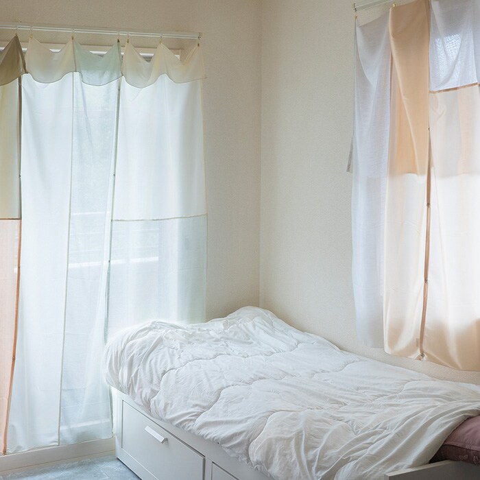 部屋の間仕切りや収納の目隠しなど、暮らし方に合わせてカーテンで境界をつくることで、気軽に空間づくりを楽しめます。