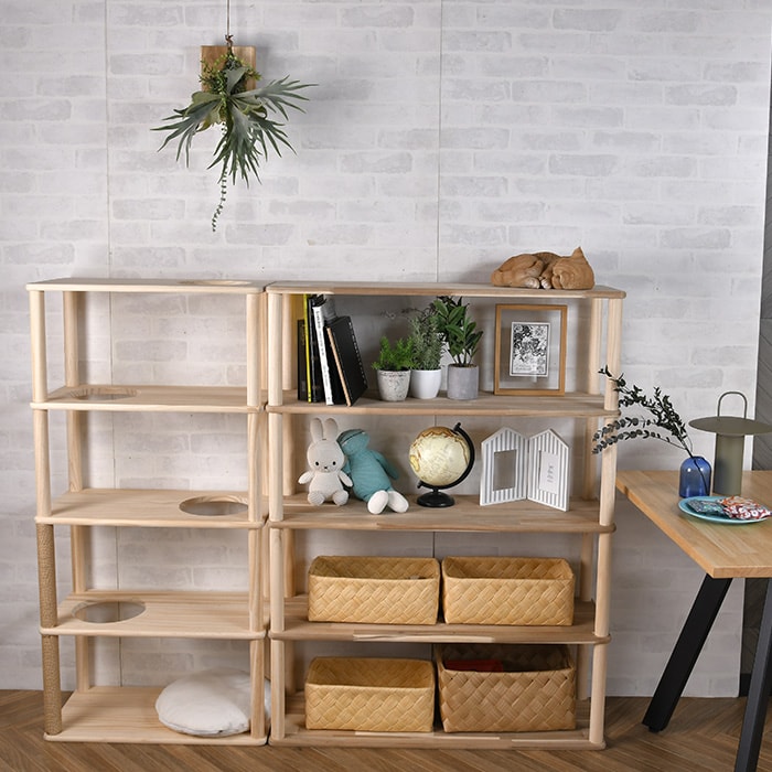 ポールや別サイズの棚板と組み合わせて、お好みのサイズでキャットタワーや収納棚が完成。