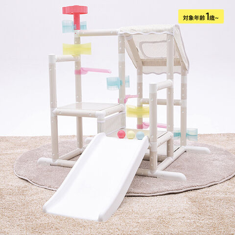 ・一畳以下のスペースに置けるコンパクトサイズに、ハイハイトンネル、ボールころがし、よじのぼり、すべりだいなど、たくさんの遊びが詰まっています。お家の限られたスペースでいつでも全身あそびができます。