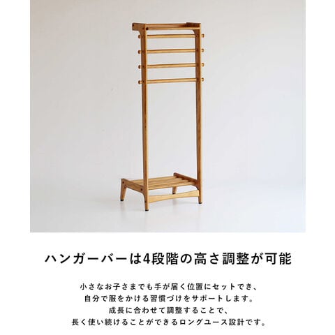 ハンガーバーは4段階の高さ調整が可能。小さなお子さまでも手が届く位置にセットでき、自分で服をかける習慣づけをサポートします。