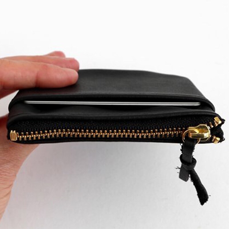 シックなブラックの牛革に、ファスナーのゴールドが輝きを添えています。ファスナー金具には本体と同じ革の引き手が付いているので、つまみやすく便利です。
