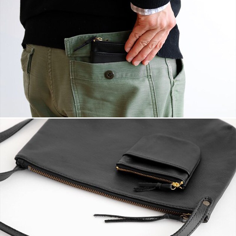 マチのないフラットな形。外側にはポケットがひとつ。カード類が2枚ほど入るため、交通系ICカードとクレジットカードだけを持ち歩く方にぴったりです。