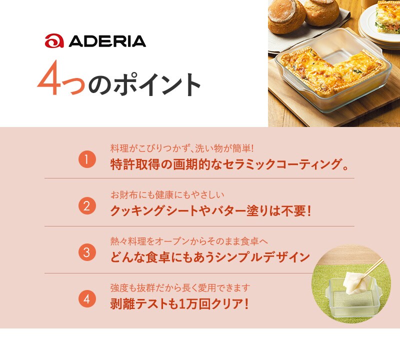 グラタンのチーズなど、オーブン料理は器にこびりついた汚れを落とすのが大変なイメージをお持ちではありませんか? セラベイクは特許取得のセラミックコーティング加工により、撥水撥油でこびりつきにくく、さっと汚れが落ちる革新的なオーブンウェアです。こちらは1人~2人分のグラタンやラザニアにちょうどいい、800mlのスクエアタイプです。