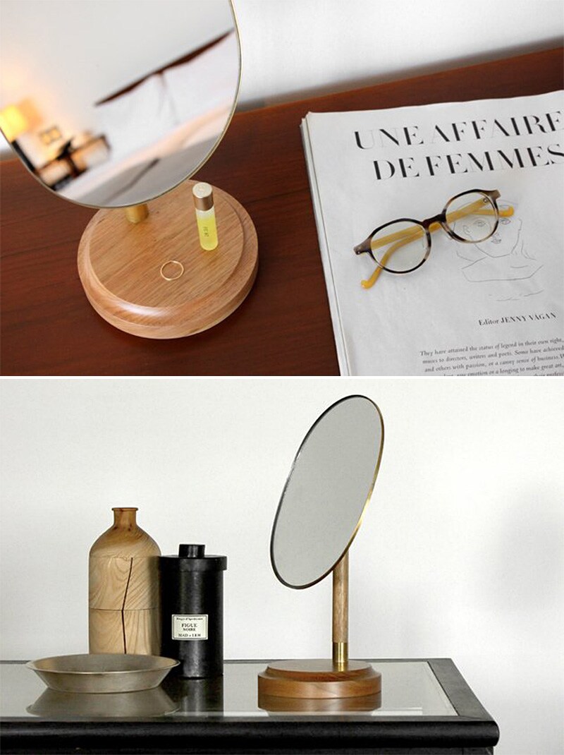 天然のクルミの無垢材と真鍮の組み合わせがエレガントな卓上ミラー。毎日顔を合わせるものだから、飽きのこない、控えめだけれど愛着を覚えるようなデザインを目指しました。覗くたび、優雅な気分になれるミラーです。