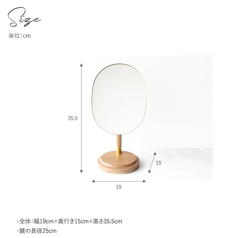 鏡は穏やかな印象の面長シルエット。鏡の角度は背面の蝶ネジで自由に調整することができます。正面にまっすぐ立てた状態から180度(真裏にも)回転させて調整が可能です。