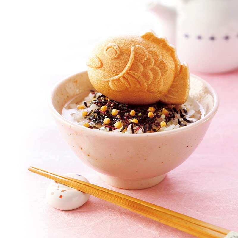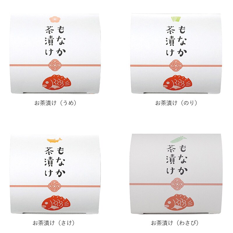 めでタイかたち。たべタイおいしさ。みんなに幸せを届けるタイ型の最中で、4種類のお茶漬けを包みました。お酒が好きな方や甘いものが苦手な方へも贈ることができるギフトセットです。