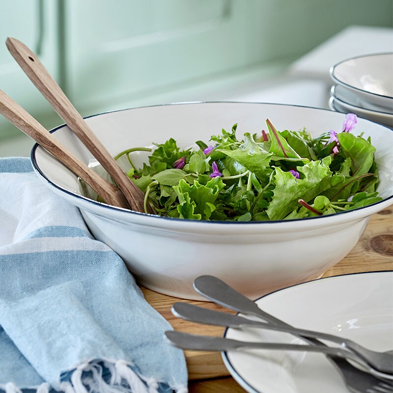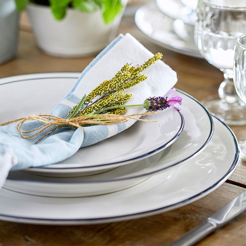 艶のある白とネイビーのデザインはまるでホーロー食器のようですが、手作業ならではの色や形の“ブレ”が温もりを感じさせてくれます。コーディネート次第でカジュアルにもエレガントにもなり、毎日の食卓をヨーロッパのカフェのような雰囲気に演出します。