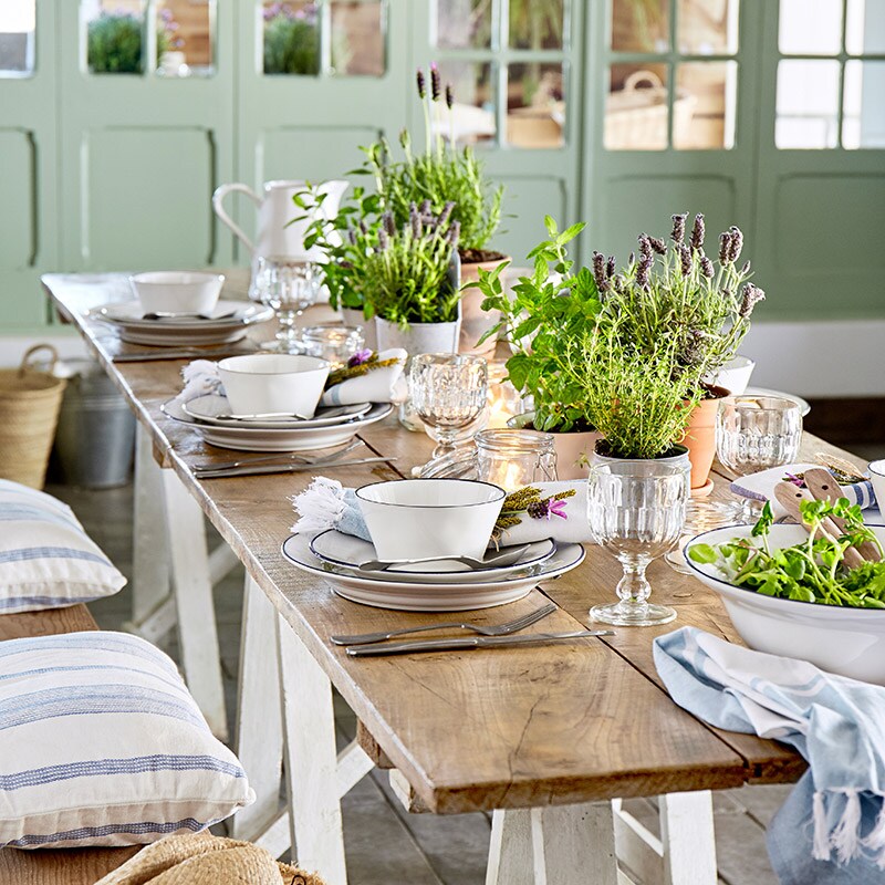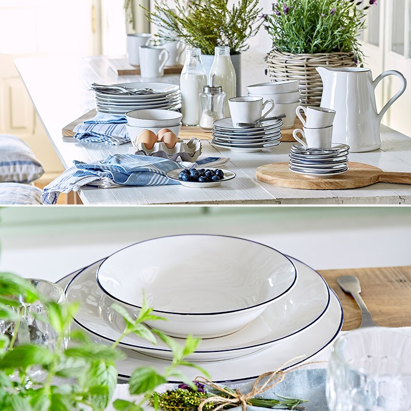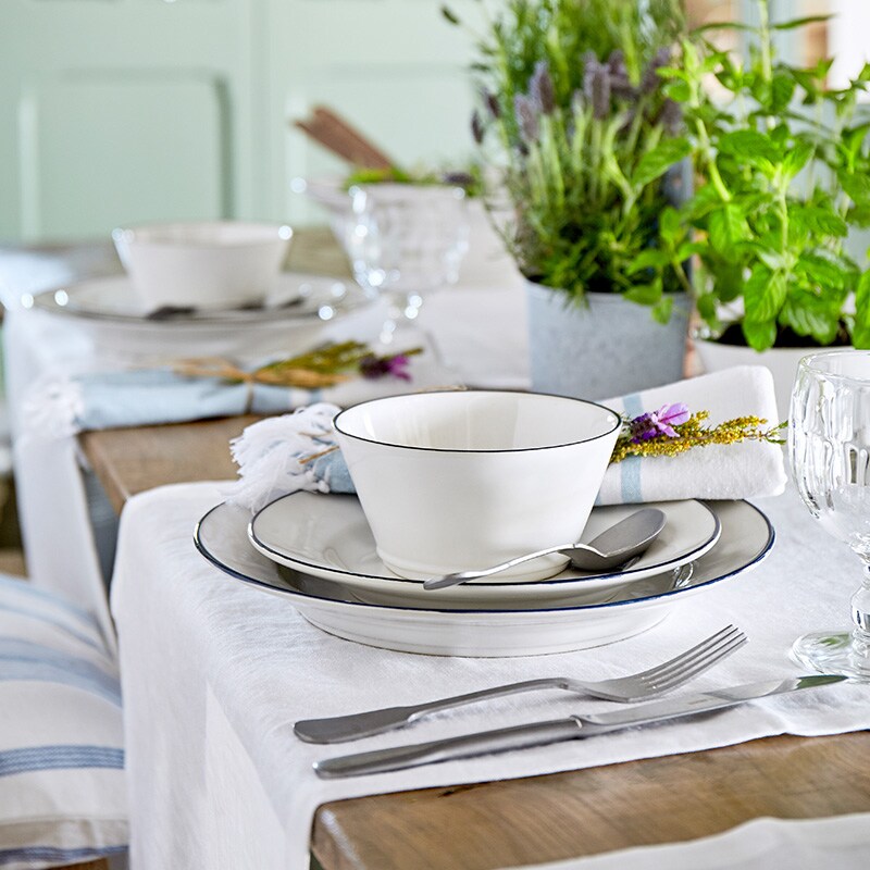 艶のある白とネイビーのデザインはまるでホーロー食器のようですが、手作業ならではの色や形の“ブレ”が温もりを感じさせてくれます。コーディネート次第でカジュアルにもエレガントにもなり、毎日の食卓をヨーロッパのカフェのような雰囲気に演出します。