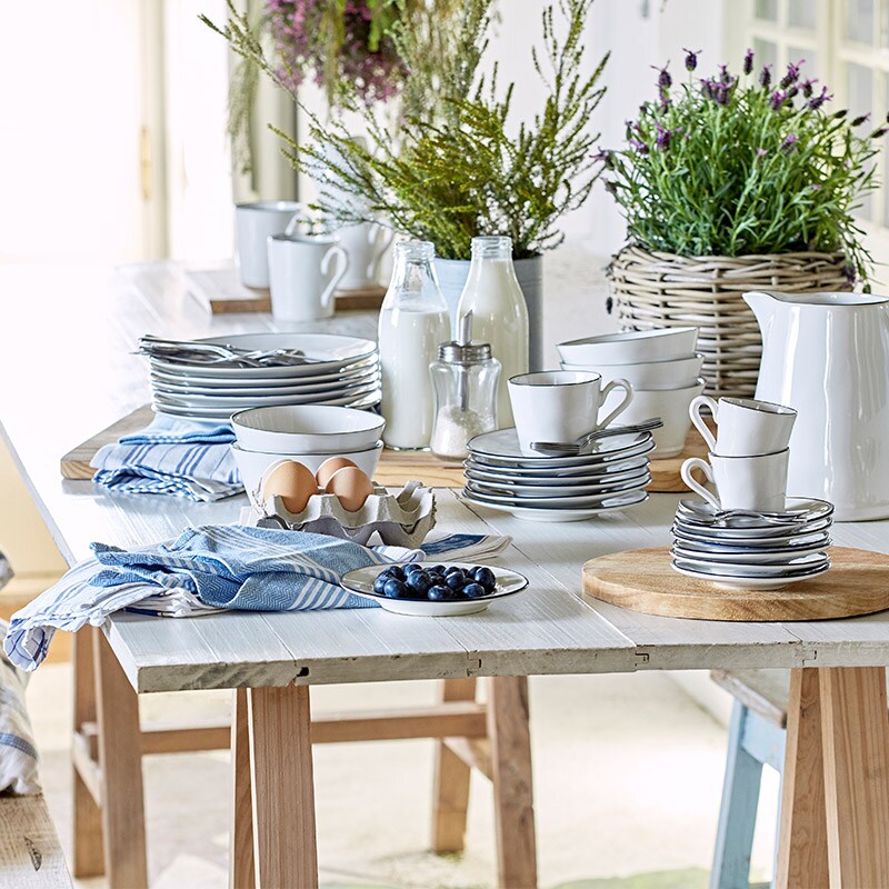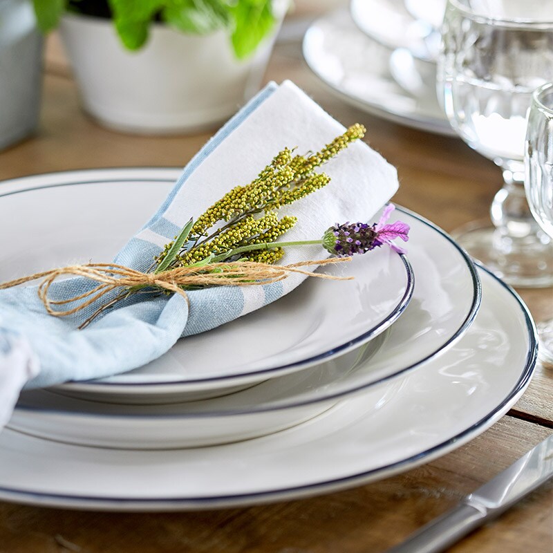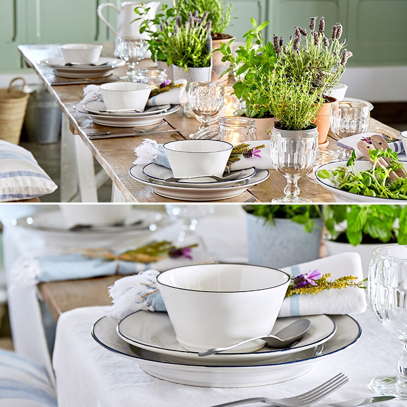 艶のある白とネイビーのデザインはまるでホーロー食器のようですが、手作業ならではの色や形の“ブレ”が温もりを感じさせてくれます。コーディネート次第でカジュアルにもエレガントにもなり、毎日の食卓をヨーロッパのカフェのような雰囲気に演出します。