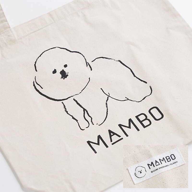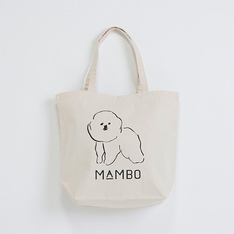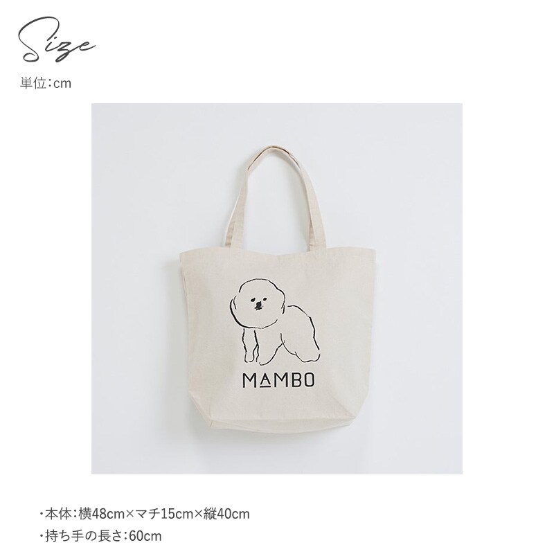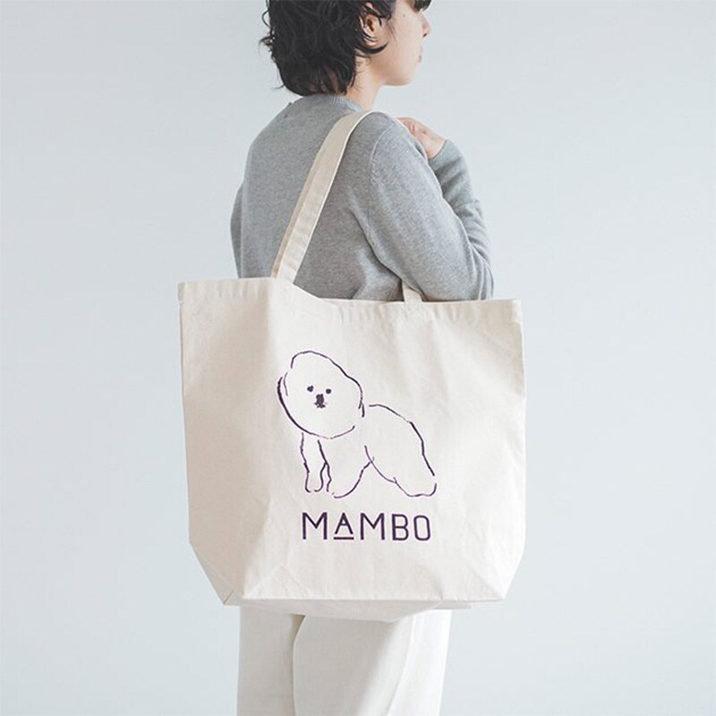 イラストレーター 塩川いづみさんの描いた「ビション・フリーゼ」がモチーフの、人気のMAMBOシリーズの大きなトートバッグ。ナチュラルな生成り色の生地で、やわらかな印象のアイテムです。どんなファッションにも馴染むので、幅広いシーンで気軽にお使いいただけます。
