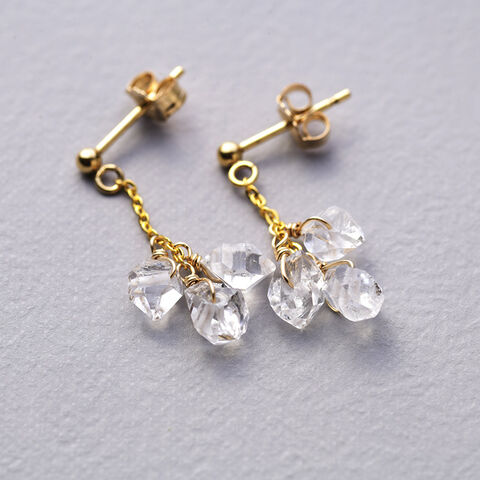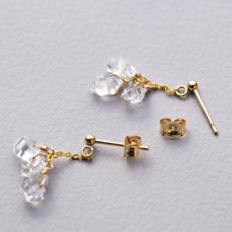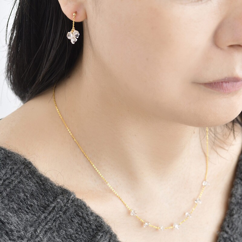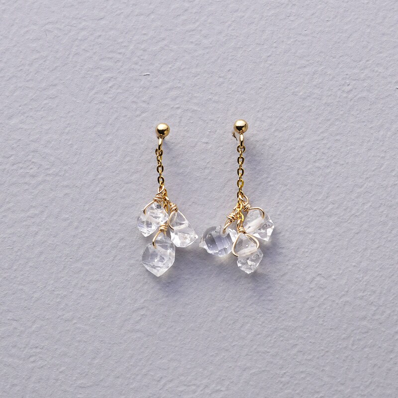 「ハーキマーダイヤモンド」を3石、段々と連なるようにあしらった、ちょっぴり華やかなピアス。米国ニューヨーク州ハーキマー地方で採掘された特殊な水晶で、通常の水晶よりも表面の光沢が強くダイヤモンドのような輝きです。