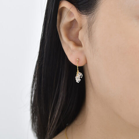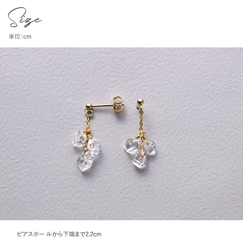 カット・輝きが魅力的なハーキマーダイヤモンドが3石合わさることで、光の反射でより輝きが増し、耳元にきらめきをプラスします。ピアスホールから下端まで約2.2cmの短めの長さなので、可憐で上品な印象でお使いいただけます。