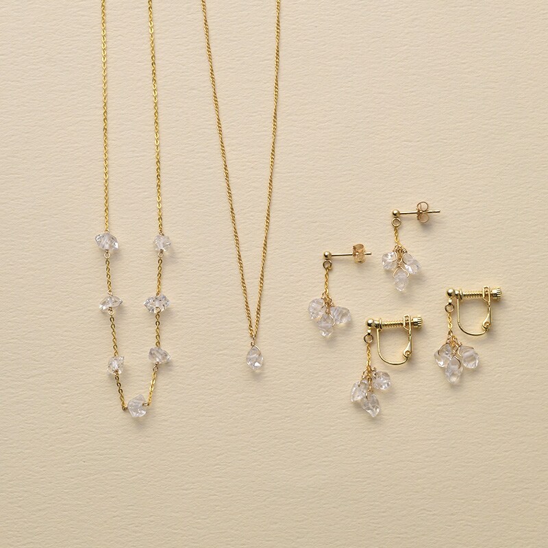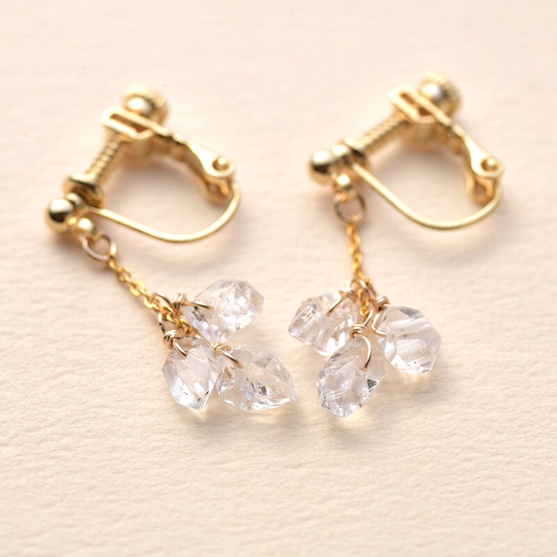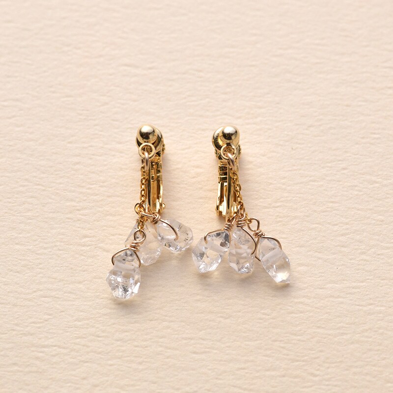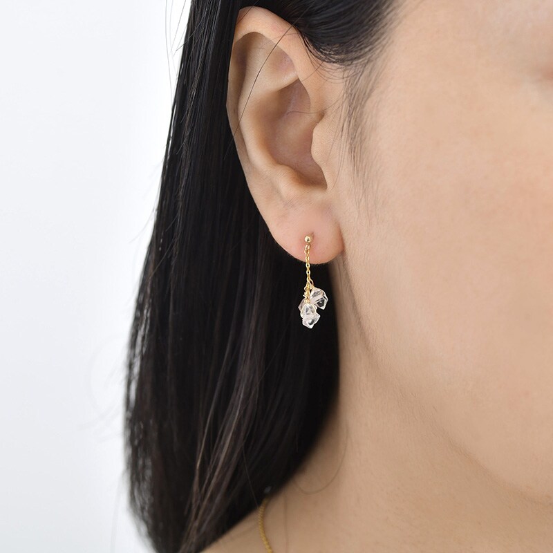 「ハーキマーダイヤモンド」を3石、段々と連なるようにあしらった、ちょっぴり華やかなイヤリング。米国ニューヨーク州ハーキマー地方で採掘された特殊な水晶で、通常の水晶よりも表面の光沢が強くダイヤモンドのような輝きです。