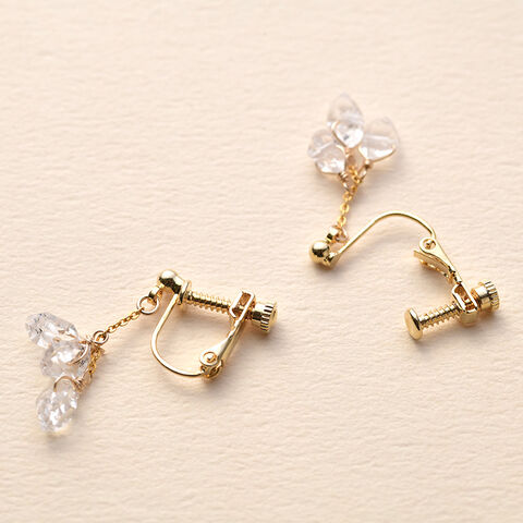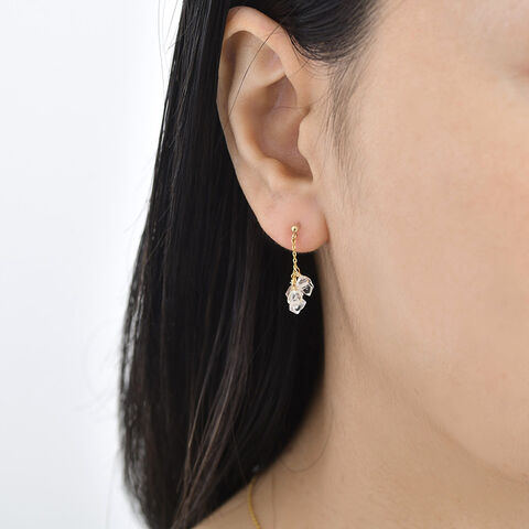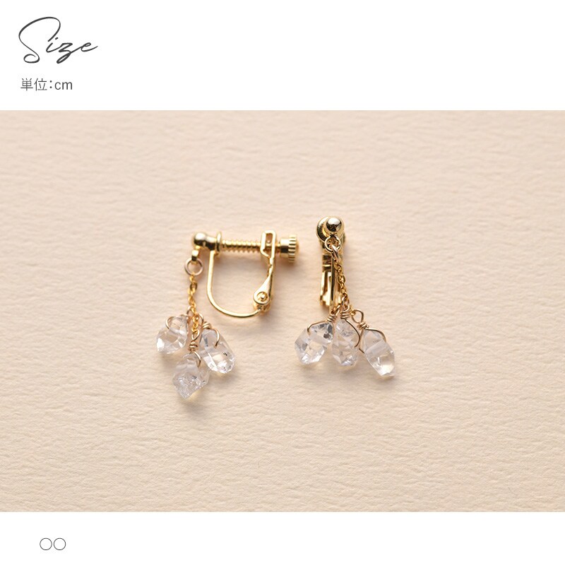 カット・輝きが魅力的なハーキマーダイヤモンドが3石合わさることで、光の反射でより輝きが増し、耳元にきらめきをプラスします。下端まで約2.2cmの短めの長さなので、可憐で上品な印象でお使いいただけます。