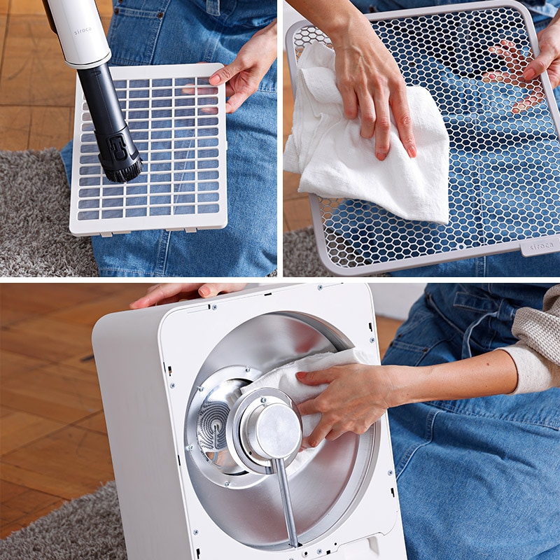 ガードは取り外し可能でいつでも清潔に保て、反射板の拭き掃除も簡単に行えます。背面のフィルターにはネジがないので、取り外しが簡単にできてお手入れラクラク。