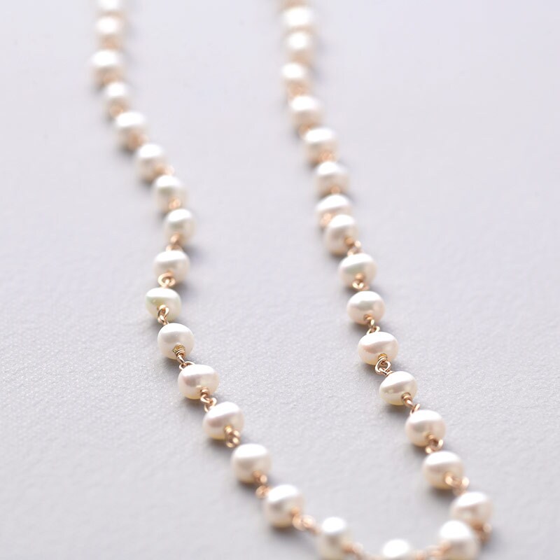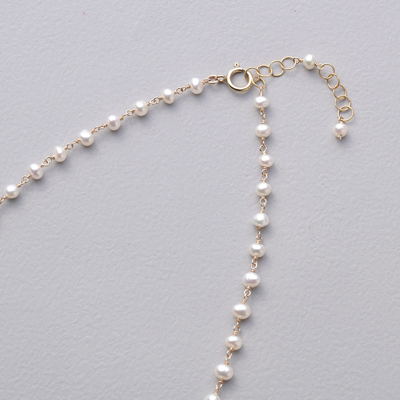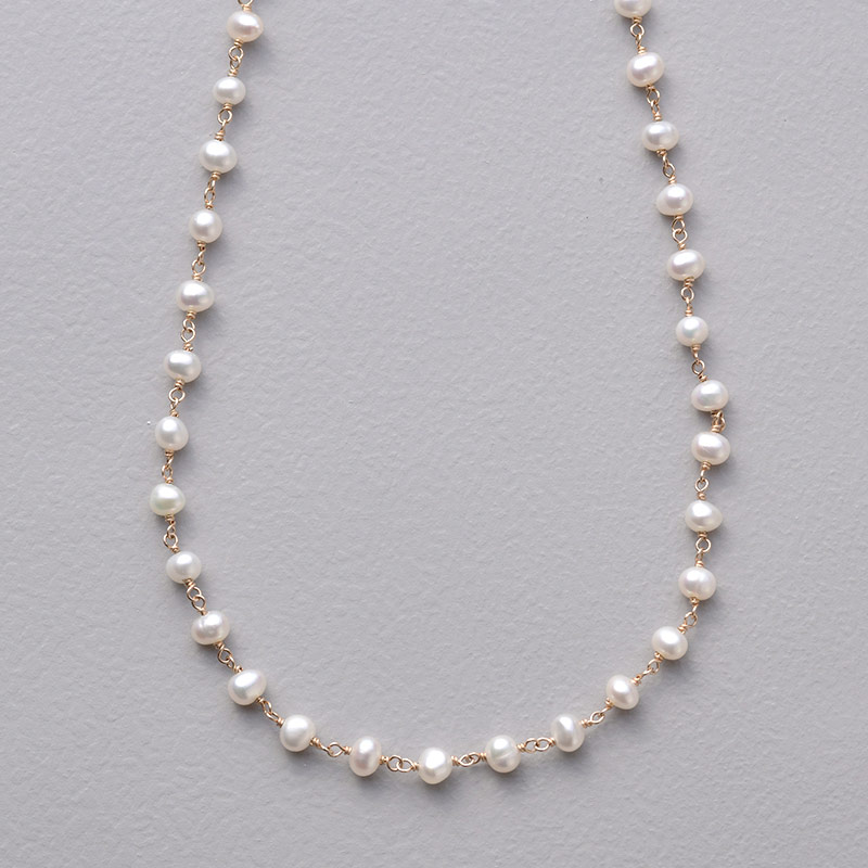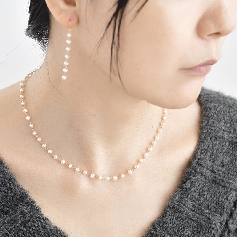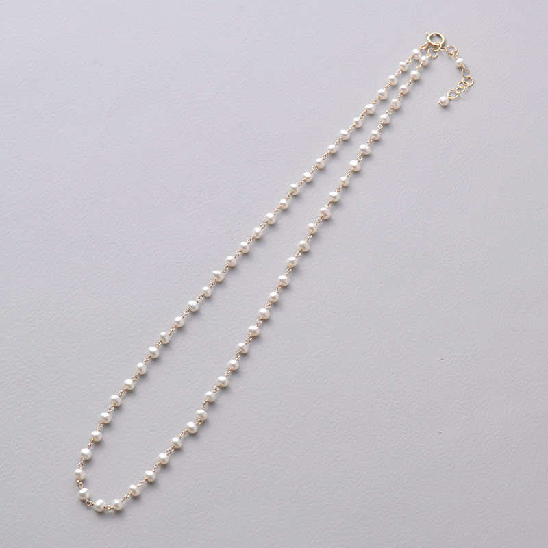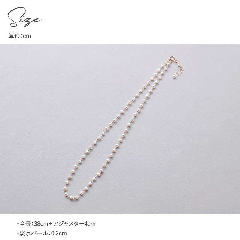 光沢のある0.2cm程の小さな淡水パールをワイヤーで丁寧につなぎ合わせた、繊細で上品な印象のネックレス。小さいながらもつややかな照りのあるパールを厳選しました。シンプルなデザインですが存在感があり、ワンランク上のおしゃれを演出します。