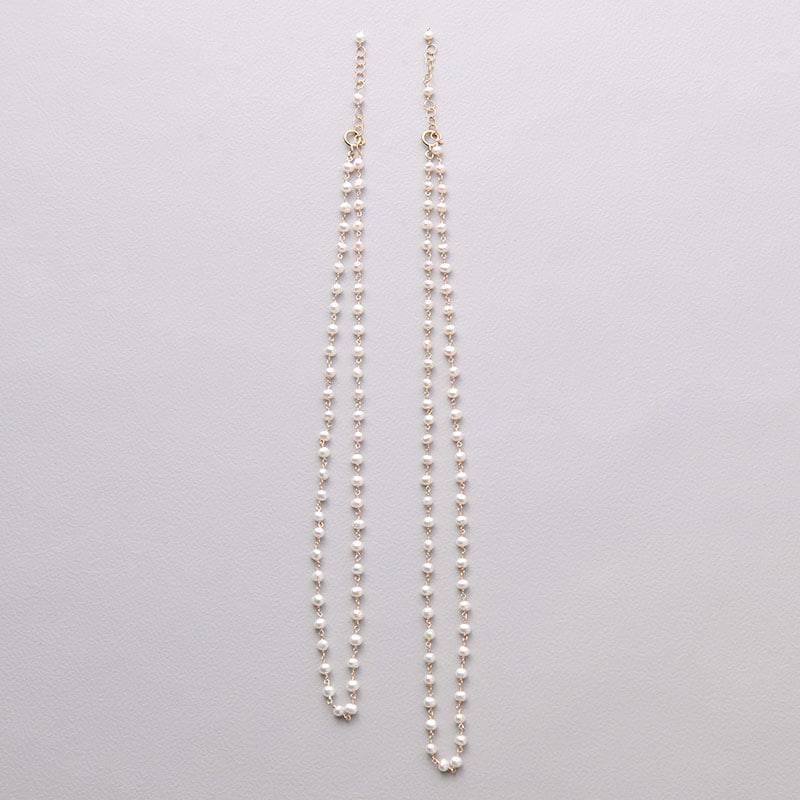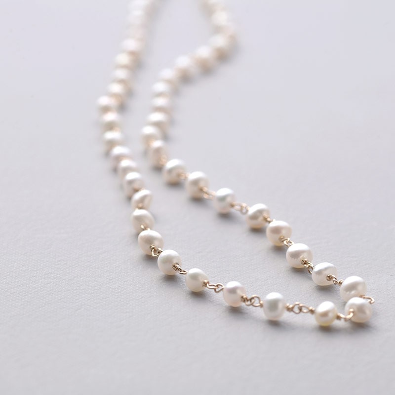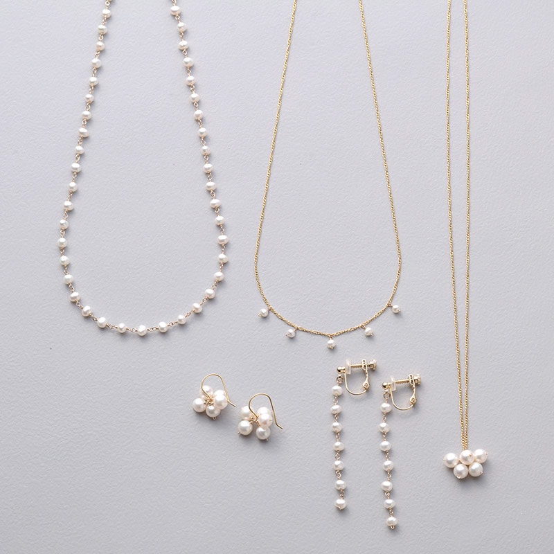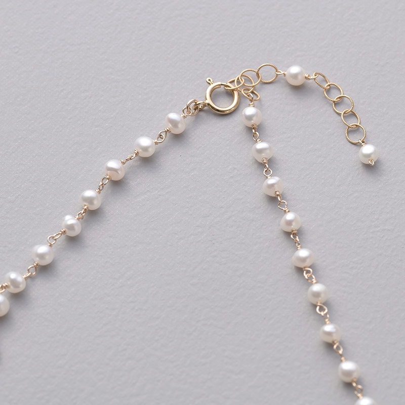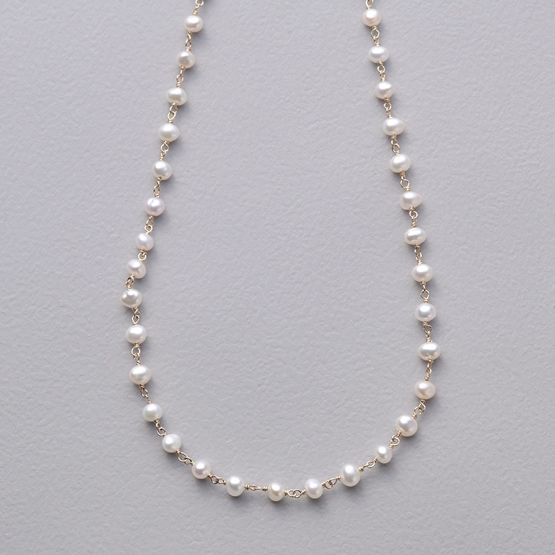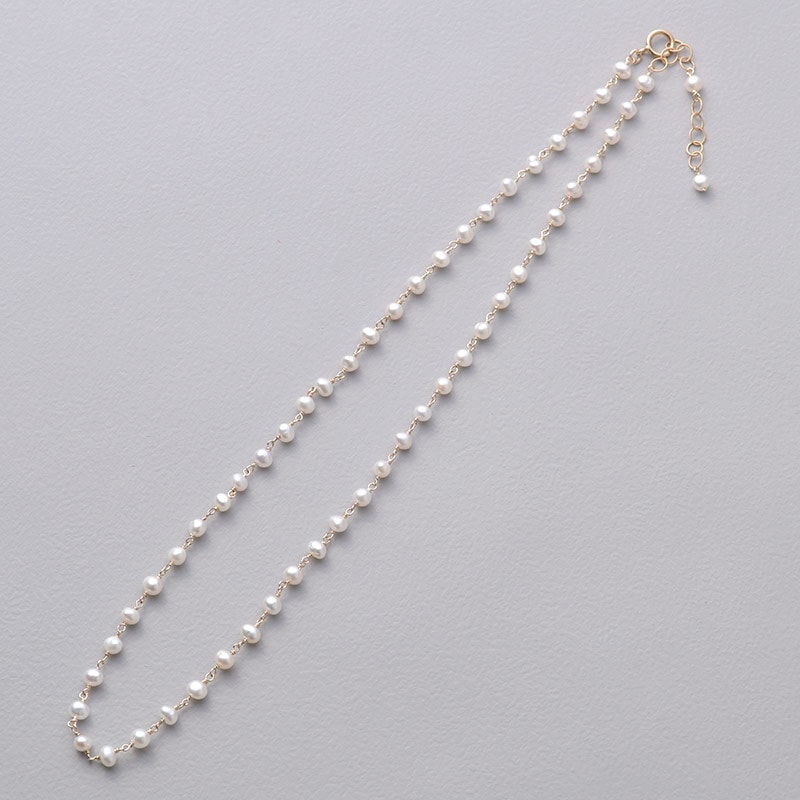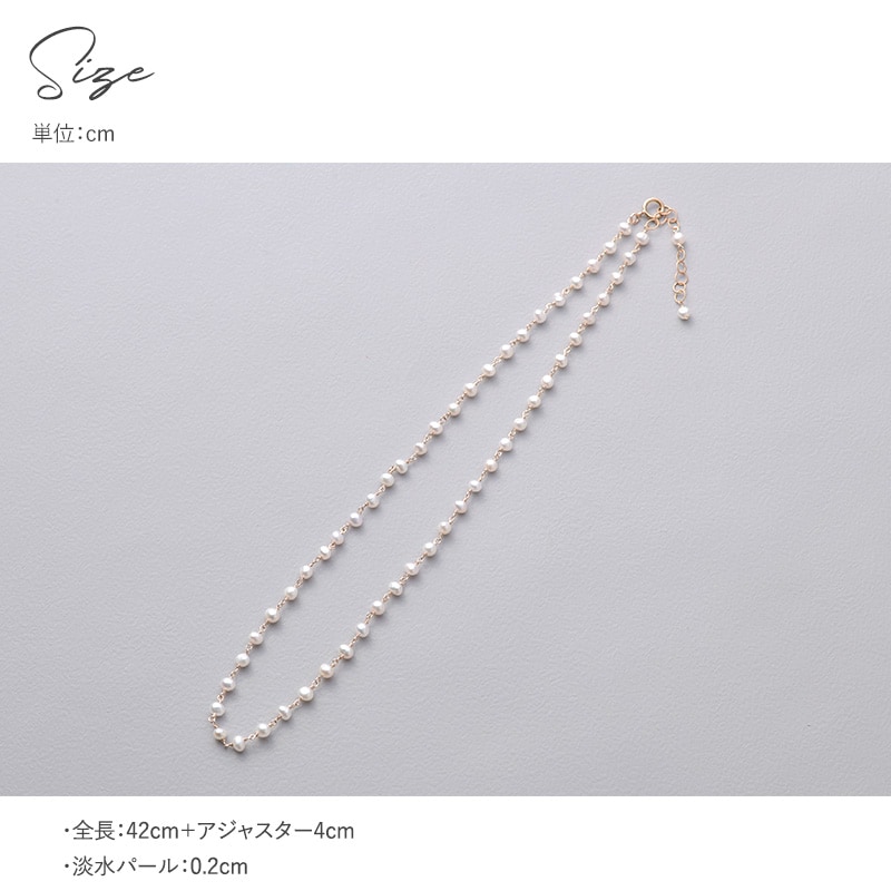 光沢のある0.2cm程の小さな淡水パールをワイヤーで丁寧につなぎ合わせた、繊細で上品な印象のネックレス。小さいながらもつややかな照りのあるパールを厳選しました。シンプルなデザインですが、全長42cmと少し長めで存在感があり、ワンランク上のおしゃれを演出します。