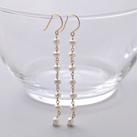 0.2cm程の小さな淡水パールを、ワイヤーで丁寧につなぎ合わせたピアス。小さいながらもつややかな照りのあるパールを厳選。ちょっと長めのデザインですが、小さなパールなので軽やかで、とても上品な印象に仕上がりました。ロングピアスを試したことのない方にもおすすめです。