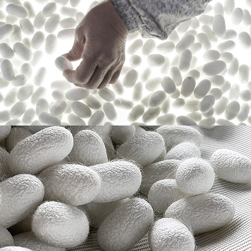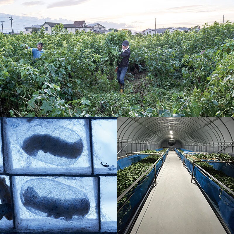 蚕の餌である桑を国内で収穫し、本社敷地内の蚕室で「ぐんま200」という品種に絞って養蚕しています。蚕は四度の脱皮を繰り返し、ようやく繭を作り始めます。天候によって温度管理を細かく調整し、桑を食べさせ始める時期を揃えるなどの手間暇をかけて飼育しているからこそ、不良率が低く、均等な大きさで良質な繭が作られます。