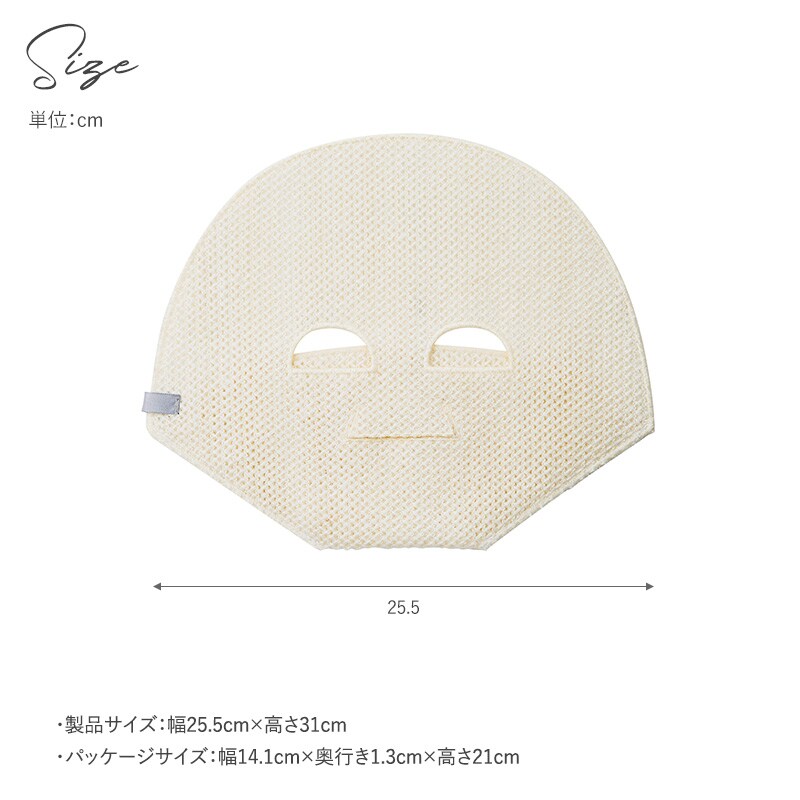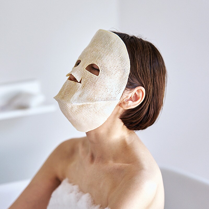 天然のスキンケア成分を含むワッフル生地を贅沢に使用した、お風呂で使うフェイスマスク。お湯に濡らして使うことで保湿効果のある天然のスキンケア成分が溶けだします。乾燥している時はシャリ感のある生地ですが濡らすと柔らかくなり、顎下まで包み込む立体形状。是非、毎日のバスルーティーンに。