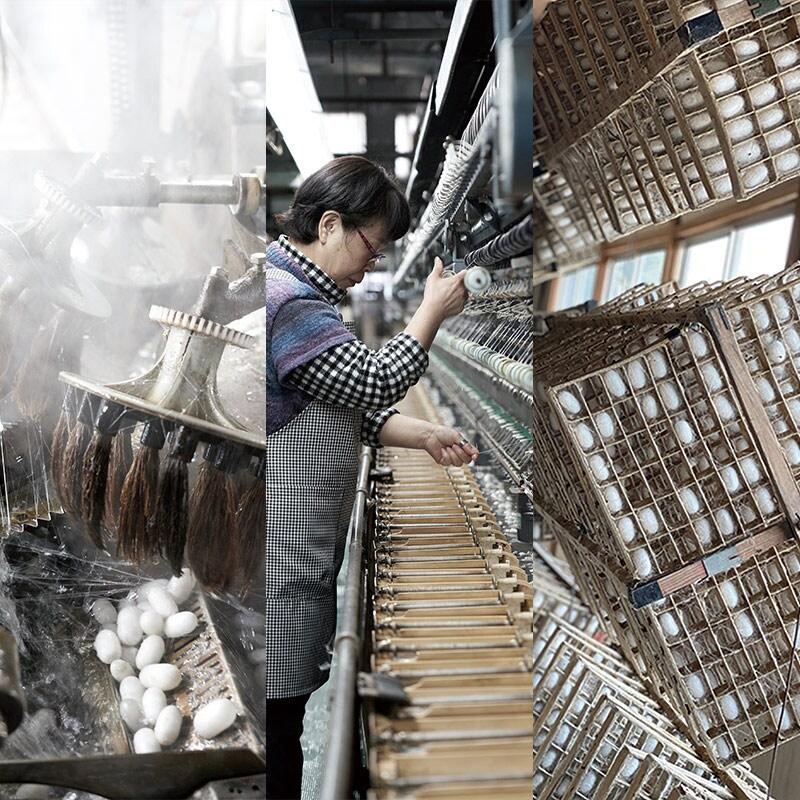 蚕の餌である桑を国内で収穫し、本社敷地内の蚕室で「ぐんま200」という品種に絞って養蚕しています。蚕は四度の脱皮を繰り返し、ようやく繭を作り始めます。天候によって温度管理を細かく調整し、桑を食べさせ始める時期を揃えるなどの手間暇をかけて飼育しているからこそ、不良率が低く、均等な大きさで良質な繭が作られます。