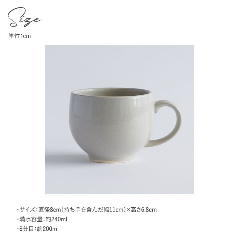 ころんとまるい、小さな形に親近感を覚えるマグカップ。8分目で約200mlと小ぶりなサイズで、ちょっとしたお茶の時間に最適です。落ち着きたいときや、ゆっくりと考えごとをしたいときなど、